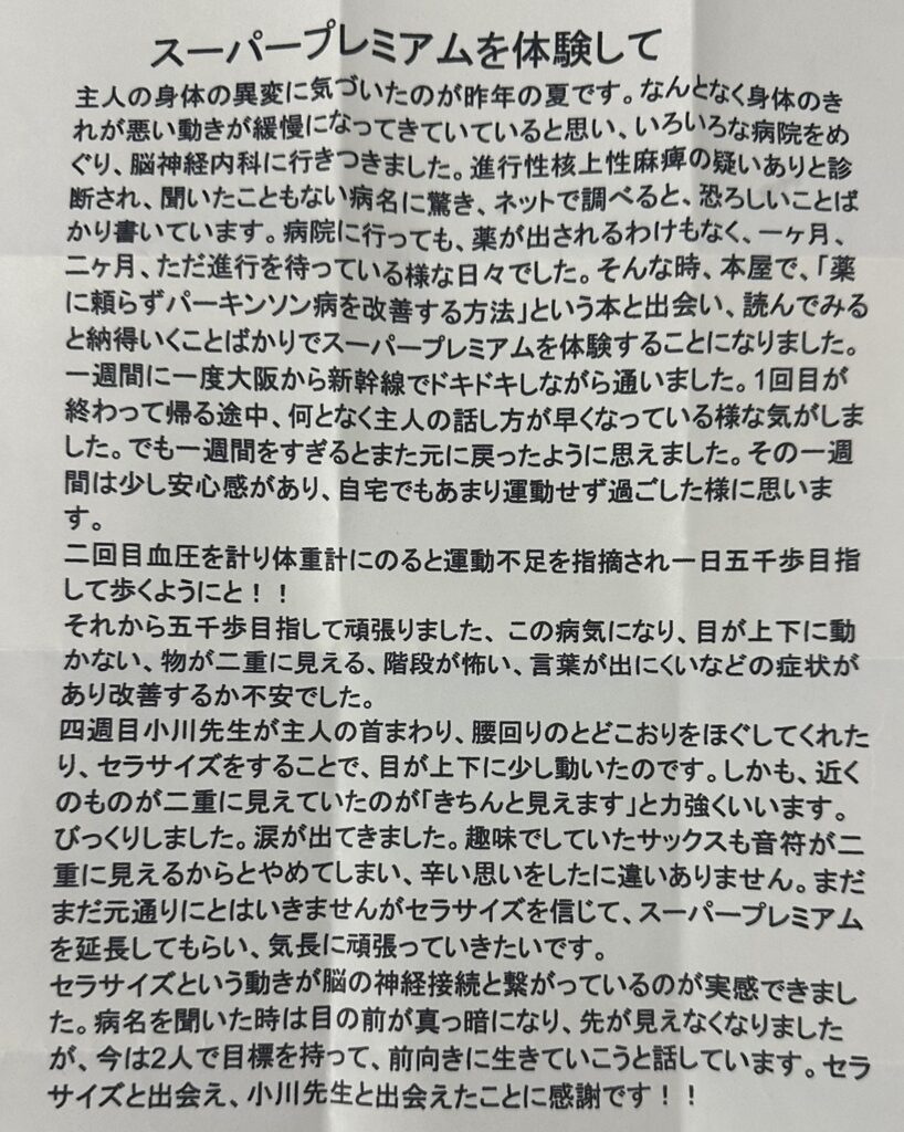 不安になるとHPの改善事例を読んで自分を励ましていたので、リハビリの順番が来た時には、小川代表に直接リハビリをしてもらえば奇跡が起こると思っていました。
